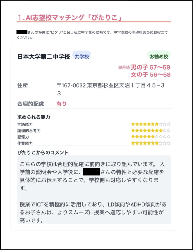 「ぴたりこ」は、一般の学校情報サイトにはない、発達障害(LD/AHDH/自閉症スペクトラム)やギフテッド(2E)のお子さんの私立中学選びに特化した情報を提供し、中学受験の目標設定を手助けするAI発達支援です。